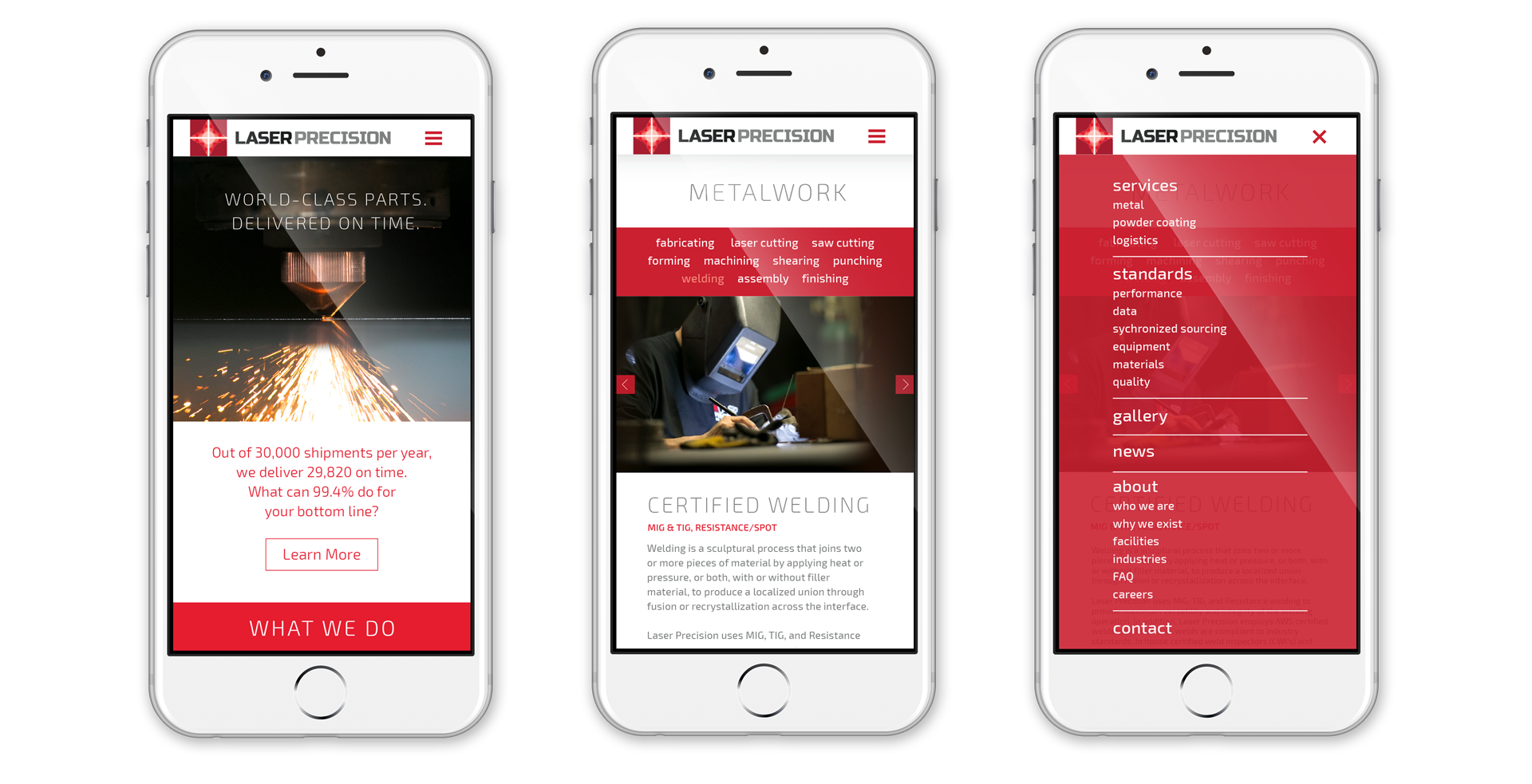 We gave Laser Precision an updated logo and a modernized website and print collateral. The website’s minimal and eye-catching home page focuses on two key differentiators, with video of processes and services playing behind the text.